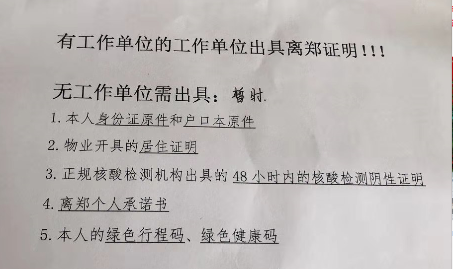 桌上张贴的离郑证明办理需知显示,需要离郑人员携带本人身份证原件和户口本原件、物业开具的居住证明、正规核酸检测机构出具的48小时内的核酸检测阴性证明、离郑个人承诺书、本人的绿色行程码、健康码。